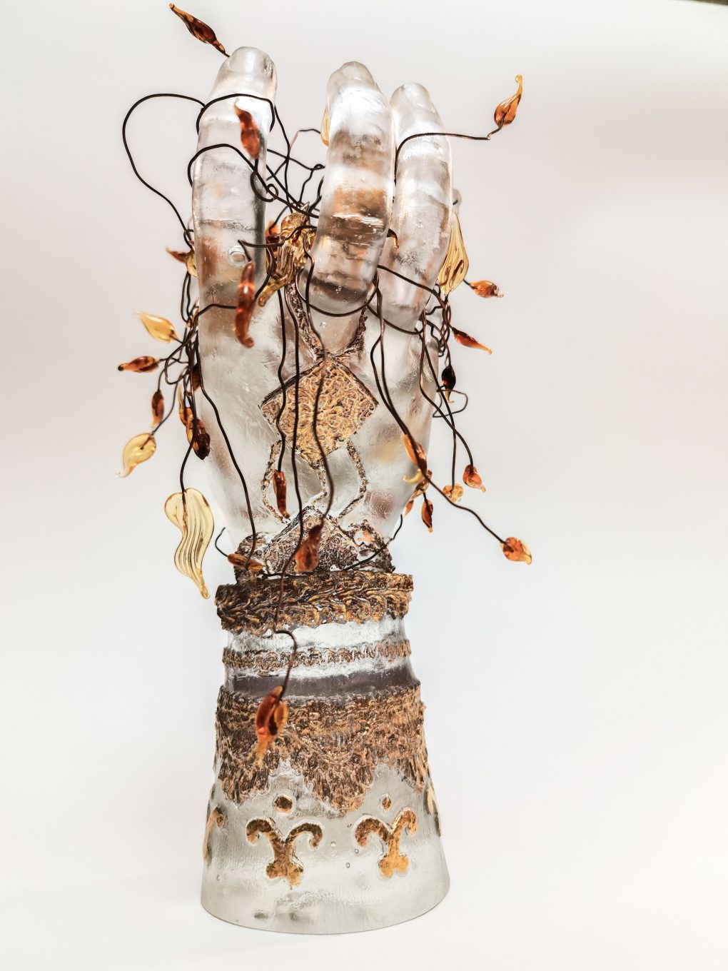 The hand is sculpted in plaster and the sleeve is designed with oriental decorations and Arabic-style jewelry. The technique used is lost wax and gilded the sleeved decorations and jewelry. The leaves are made with a lampworking technique linked by copper branches.